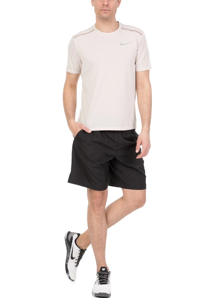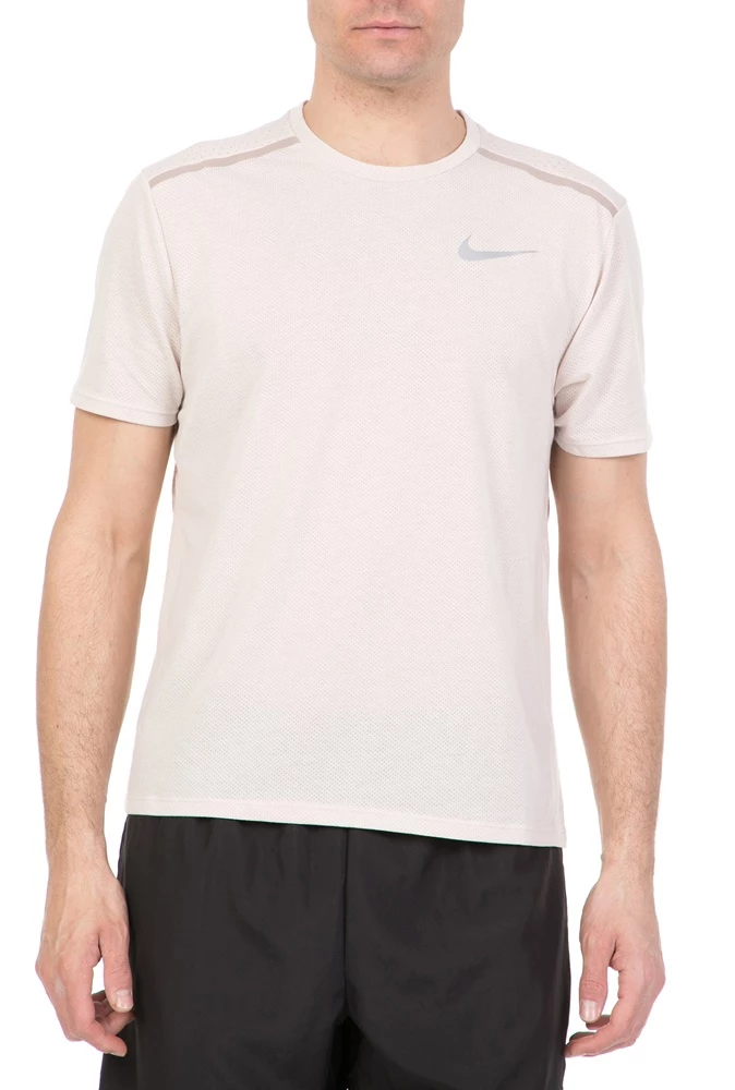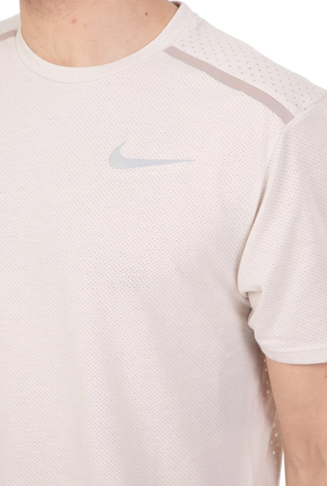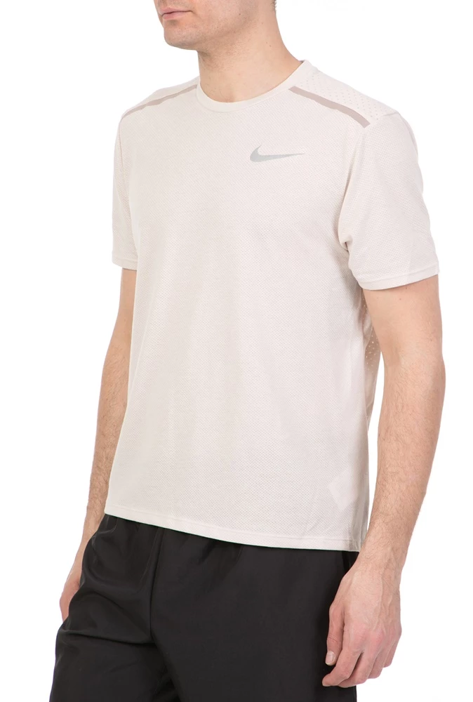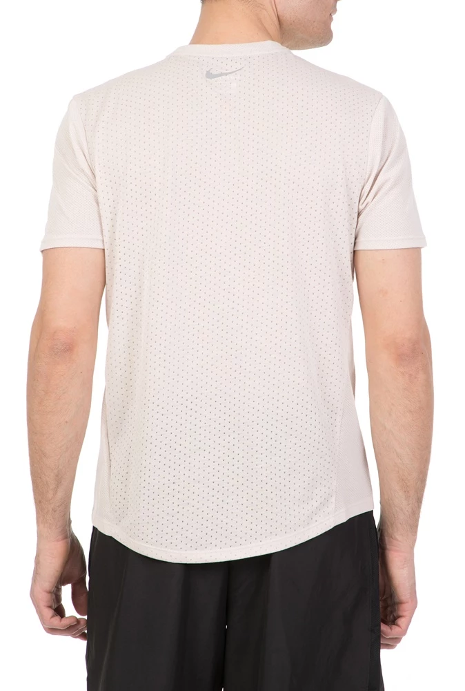 Ανδρική κοντομάνικη μπλούζα για τρέξιμο σε εκρού απόχρωση και ύφασμα Nike Breathe για στεγνή και δροσερή αίσθηση.