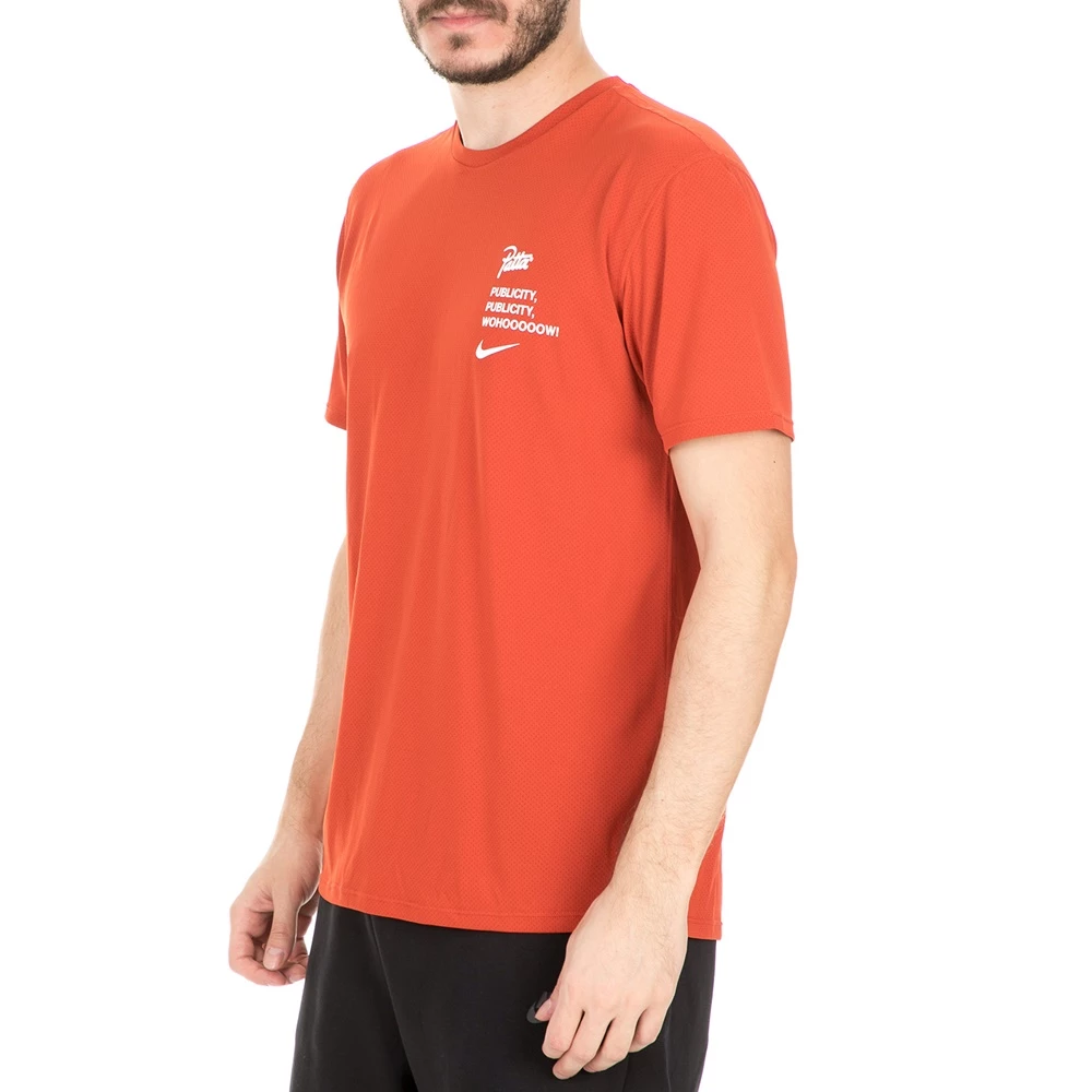 Ανδρικό t-shirt NIKE σε πορτοκαλί απόχρωση. Σε ίσια γραμμή, με κοντά μανίκια και στρογγυλή λαιμόκοψη. Στάμπα στο στήθος με γραφικό μοτίβο.