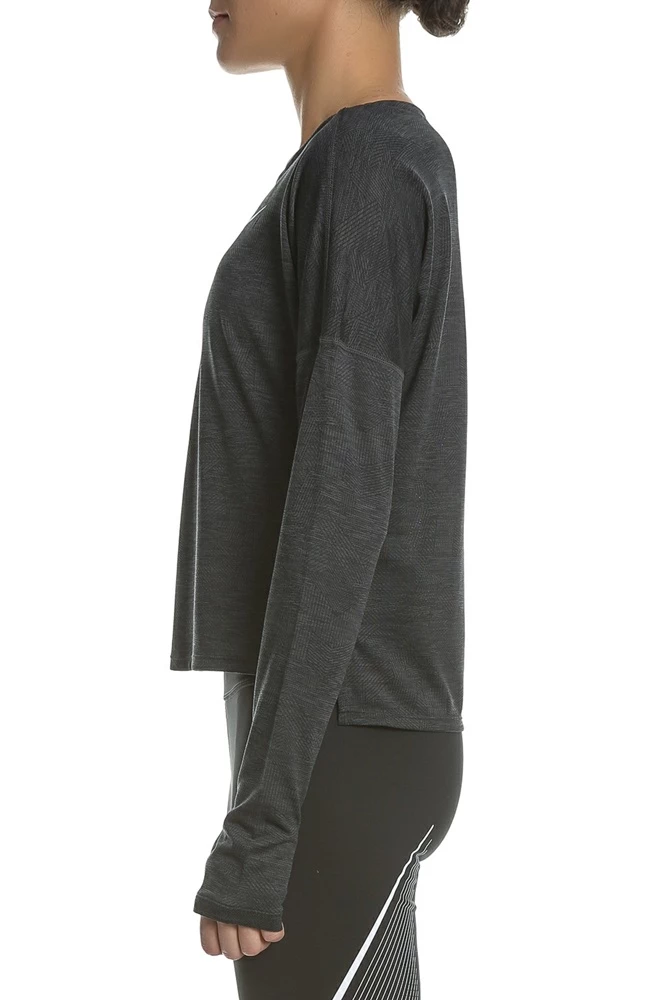 Γυναικεία μακρυμάνικη αθλητική μπλούζα στις αποχρώσεις του γκρι από δροσερό, ανάλαφρο ύφασμα που ακολουθεί την κίνηση του σώματος, προσφέροντας μοναδική άνεση και ελευθερία κινήσεων.