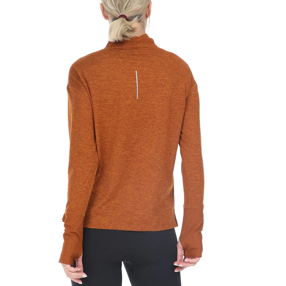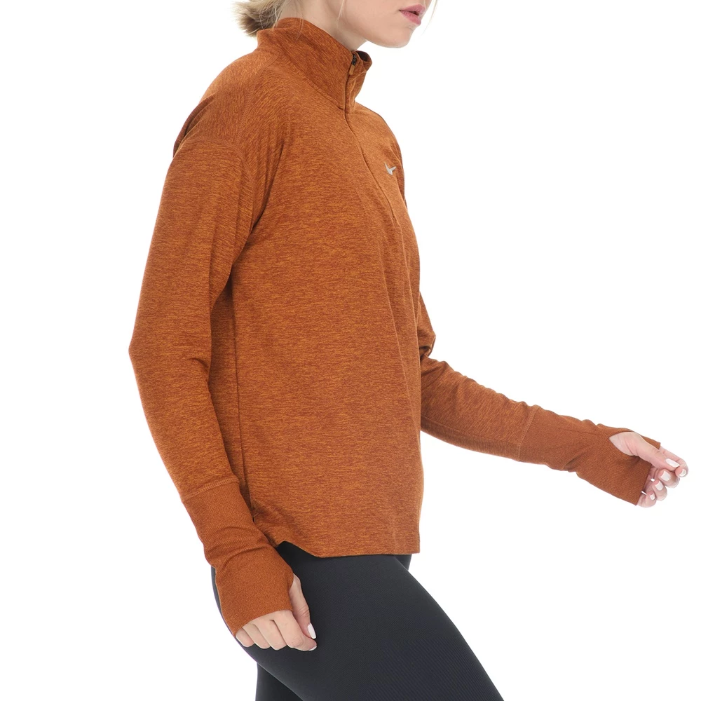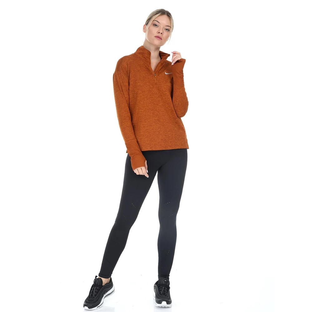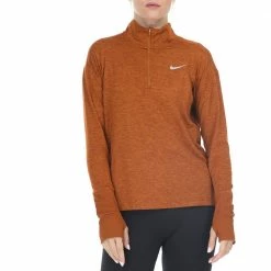 Γυναικεία μπλούζα για τρέξιμο Nike Element σε πορτοκαλί απόχρωση. Σε ίσια γραμμή από ανάλαφρο ύφασμα με τεχνολογία Dri-FIT που απομακρύνει τον ιδρώτα για στεγνή και άνετη αίσθηση. Έχει μακριά μανίκια με οπές στις μανσέτες για τους αντίχειρες και όρθιο γιακά με φερμουάρ στην λαιμόκοψη. Τύπωμα με το εμπορικό σήμα Swoosh στο στήθος και ανακλαστική λεπτομέρεια πίσω. Μικρά ανοίγματα στα πλαϊνά στην βάση για μέγιστη άνεση κατά την κίνηση