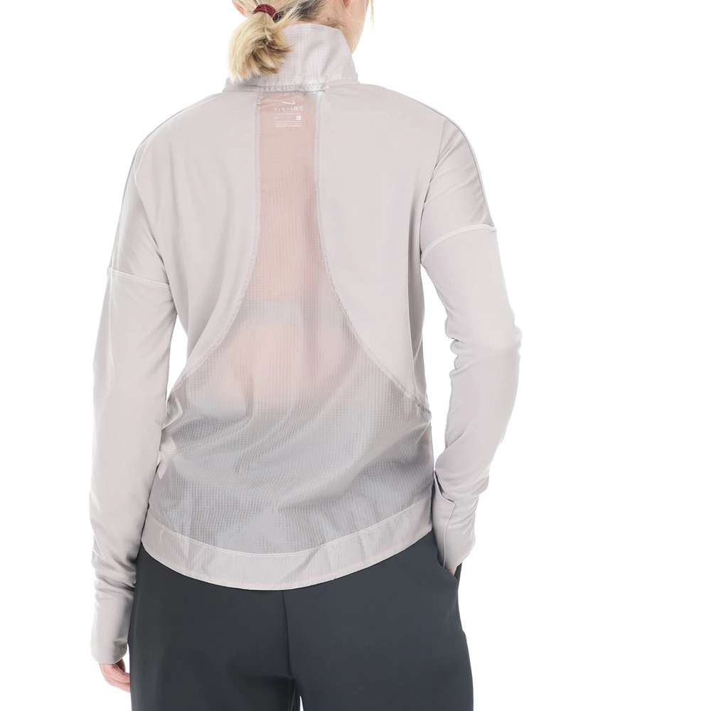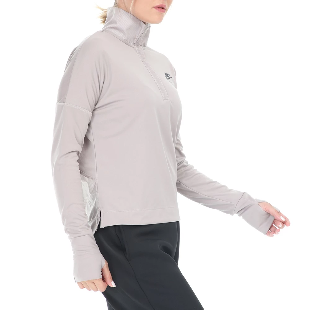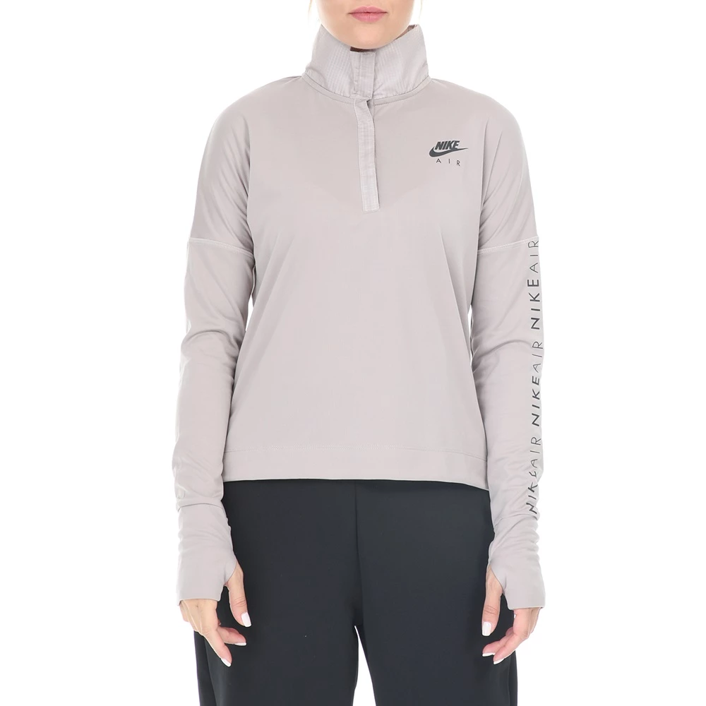 Γυναικεία μπλούζα NIKE σε μπεζ απόχρωση. Έχε μακριά μανίκια με οπές για τους αντίχειρες και όρθιο γιακά, με velcro στην λαιμόκοψη. Ημιδιάφανο πλέγμα στο πίσω μέρος και μακρύτερο μήκος για μεγαλύτερη κάλυψη. Στάμπα με το λογότυπο στο στήθος και το μανίκι.