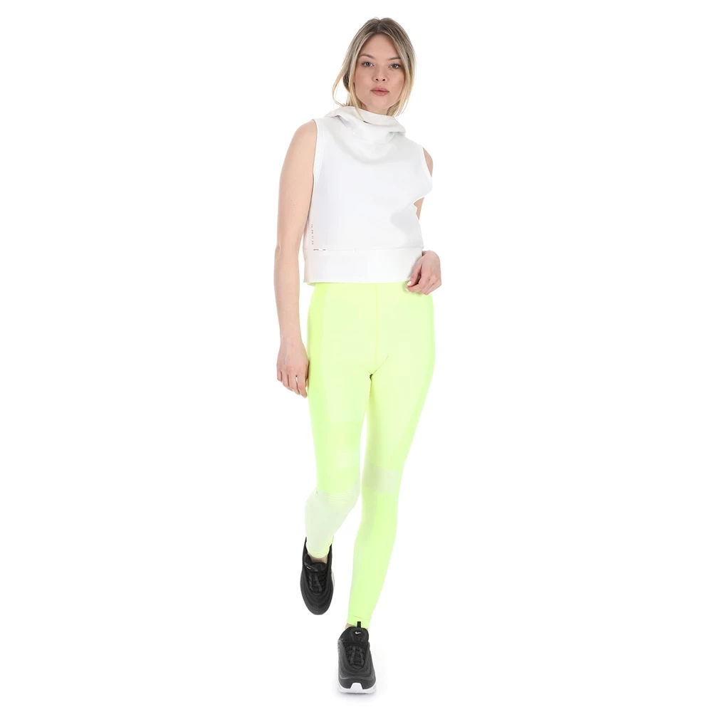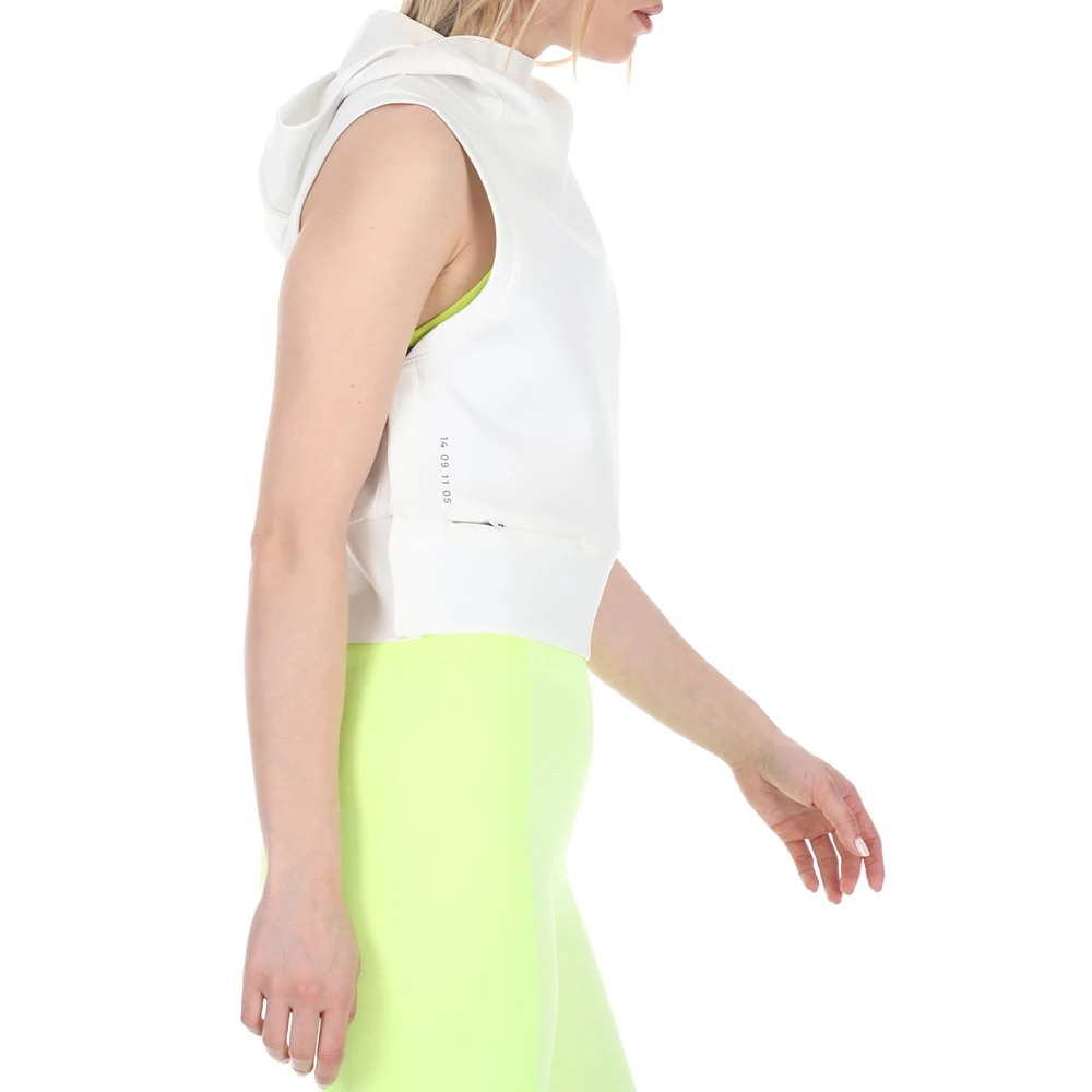 Γυναικείο αθλητικό cropped τοπ NIKE λευκό. Είναι αμάνικο με όρθια λαιμόκοψη. Διαθετει κουκούλα και μία τσέπη με φερμουάρ στη βάση.