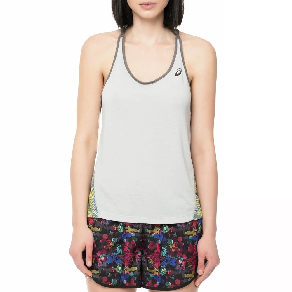 Γυναικείο αθλητικό φανελάκι σε γκρι χρώμα με print στο πίσω μέρος. Έχει χιαστί αθλητική πλάτη, άνετη γραμμή και ελαφρύ ύφασμα.