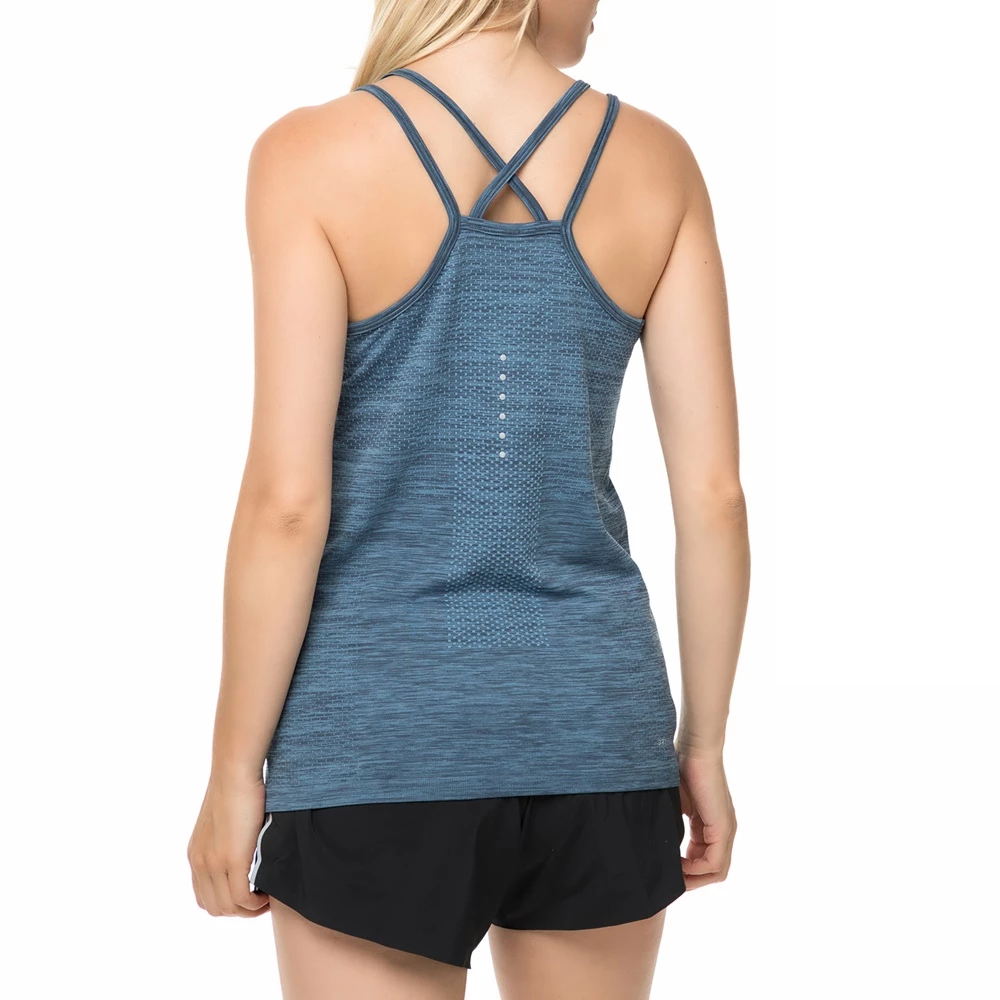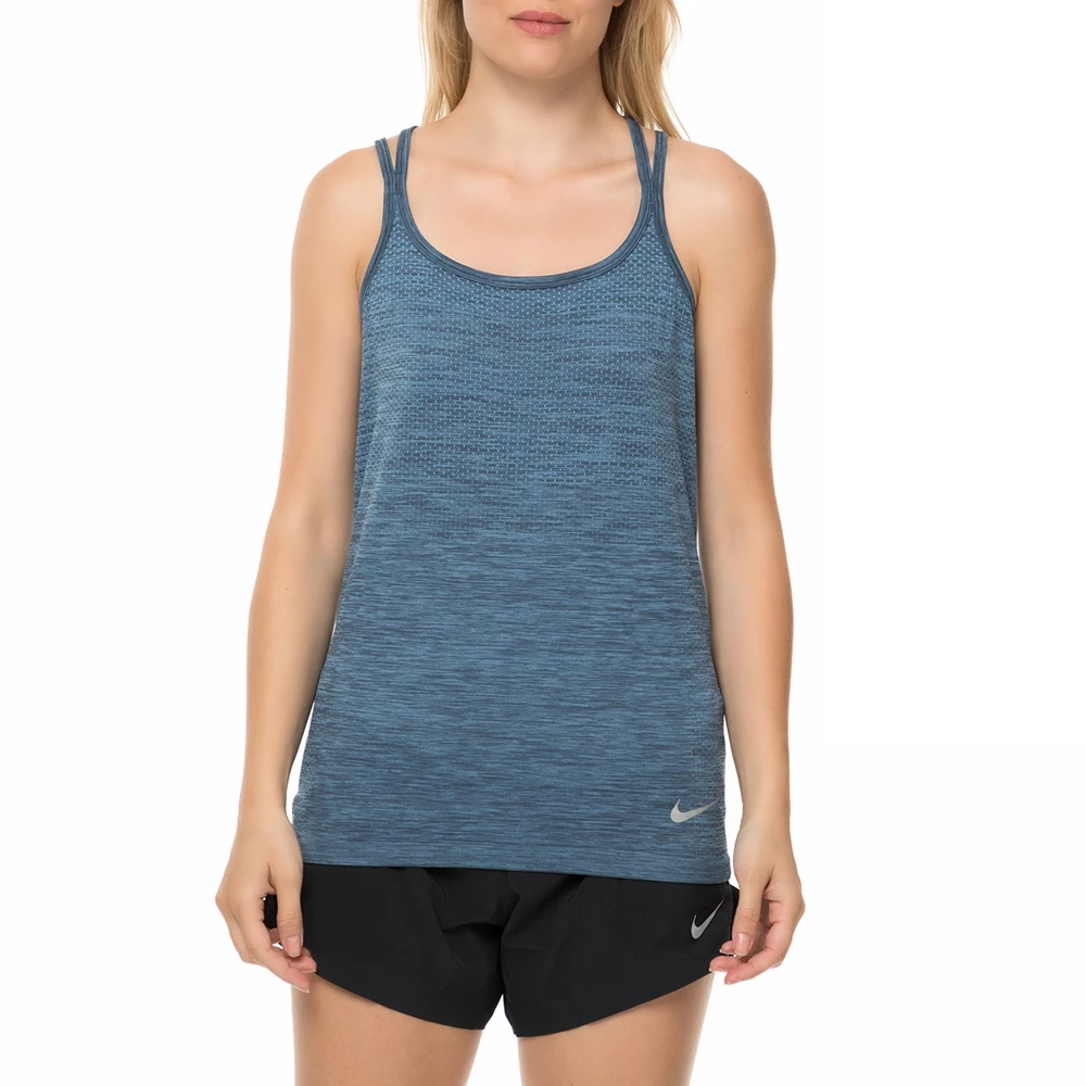 Γυναικείο αθλητικό φανελάκι Nike σε γκρι-μπλε χρώμα, εφαρμοστή γραμμή, αθλητική πλάτη και ύφασμα που απομακρύνει τον ιδρώτα για στεγνή και άνετη αίσθηση.