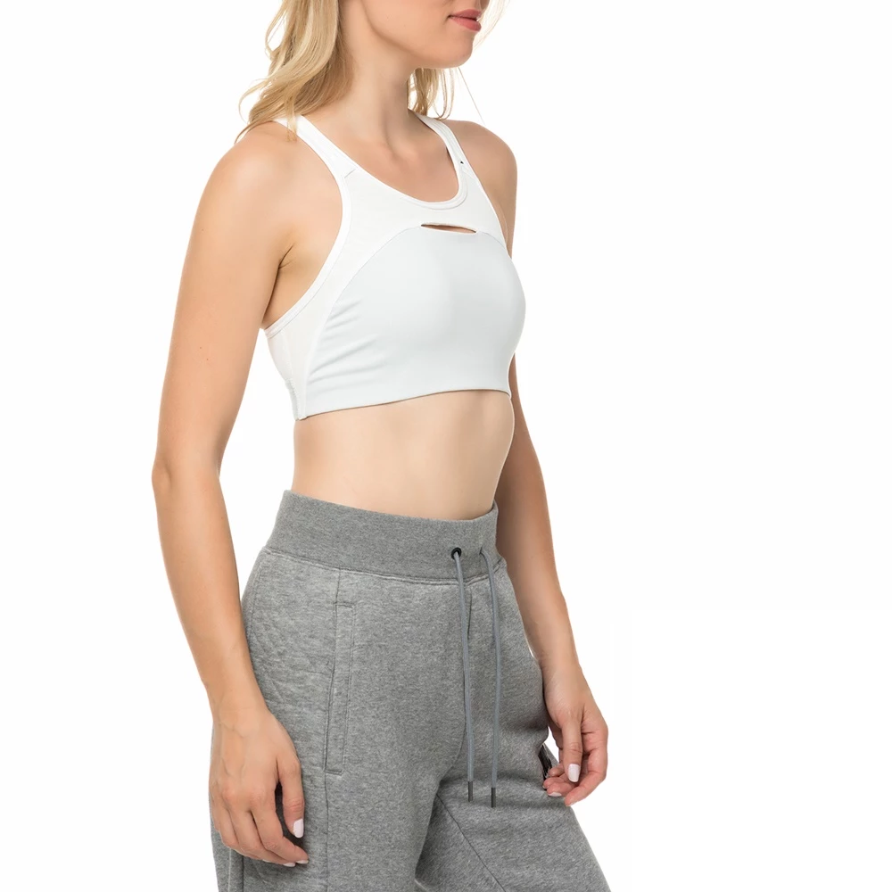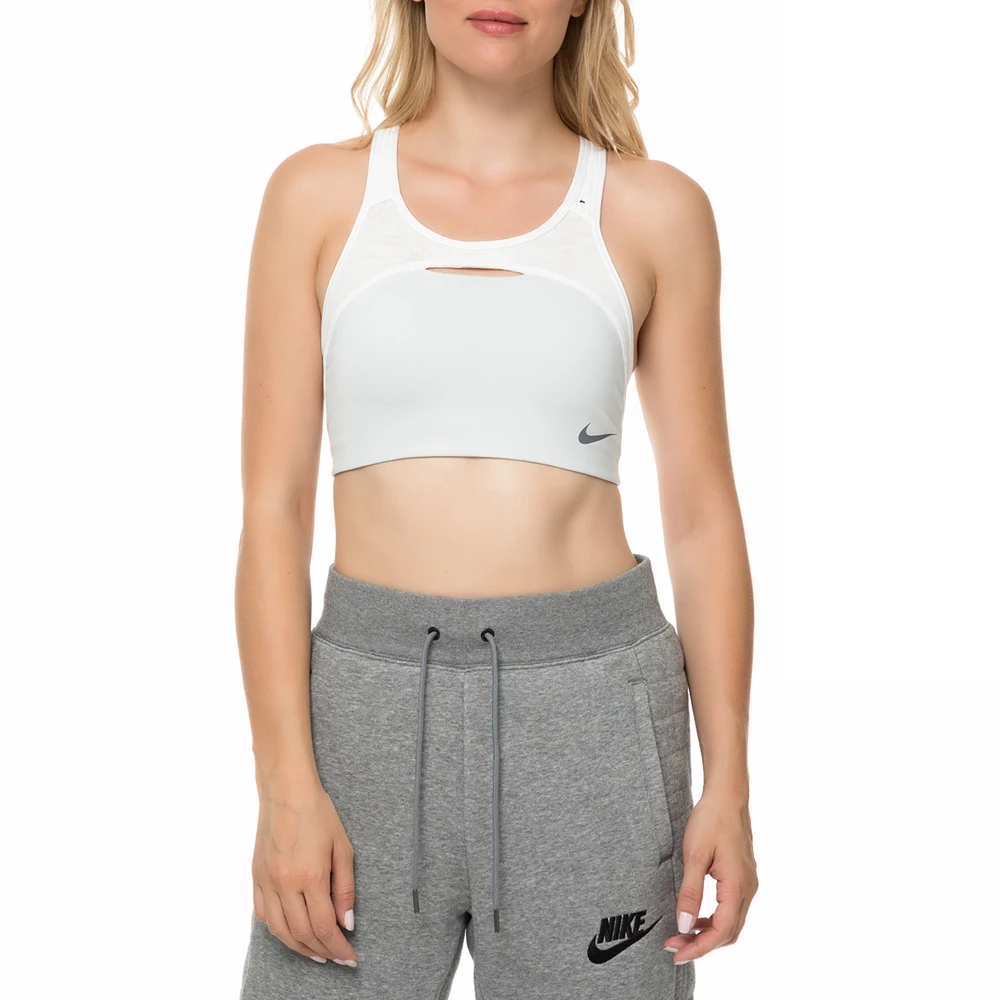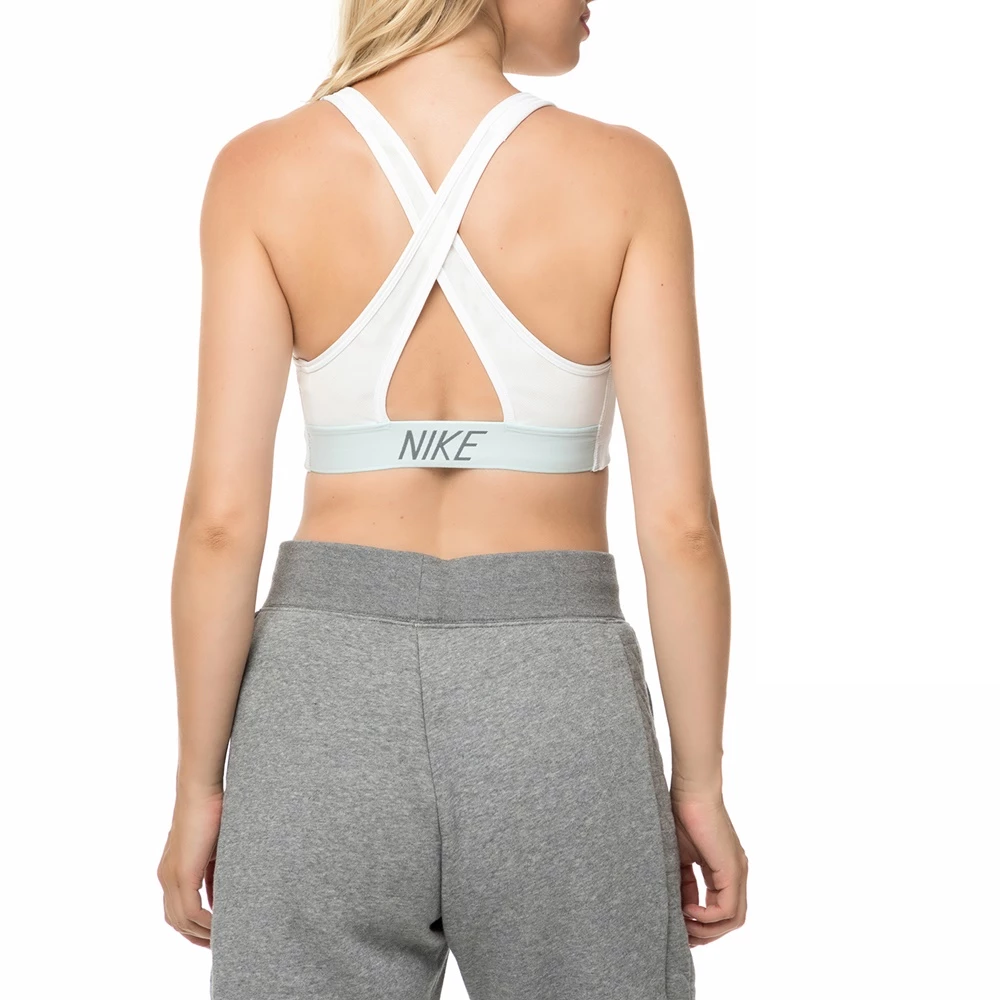 Στενό ελαστικό αθλητικό μπουστάκι σε λευκό χρώμα για μέτρια στήριξη. Η Dri-Fit τεχνολογία απομακρύνει τον ιδρώτα και εγγυάται στεγνή και άνετη αίσθηση. Διαθέτει σταυρωτές τιράντες για σφιχτή εφαρμογή. Φορέστε το μόνο του ή σε συνδυασμό με κάποιο άλλο ρούχο.