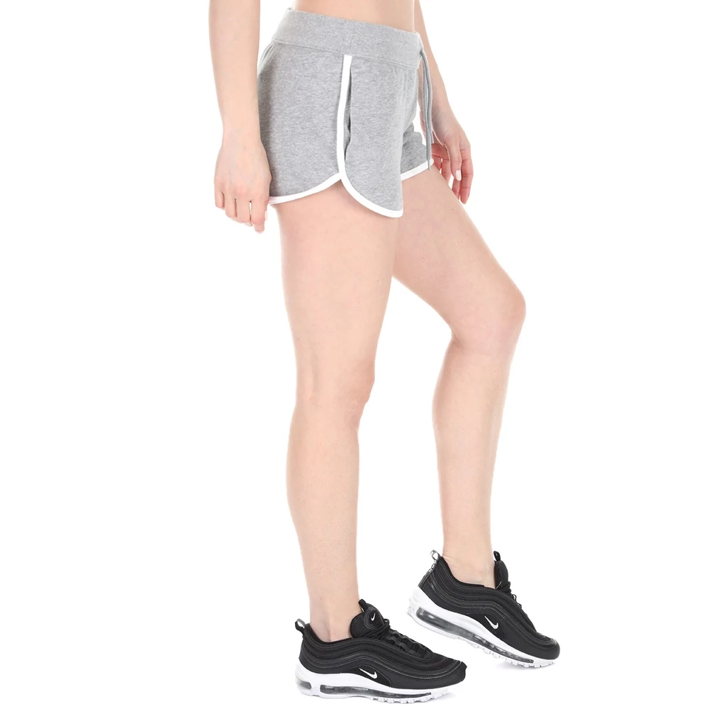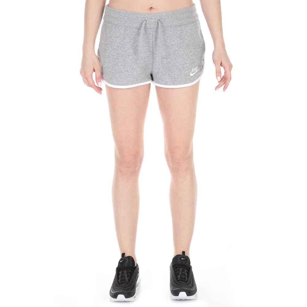 Γυναικείο κοντό σορτς από τη NIKE σε γκρι απόχρωση, με τυπωμένο λογότυπο στο κάτω μέρος και λευκή φάσα στα πλαϊνά και στο τελείωμα. Διαθέτει λάστιχο με κορδόνι στη μέση και δύο τσέπες στα πλάγια.