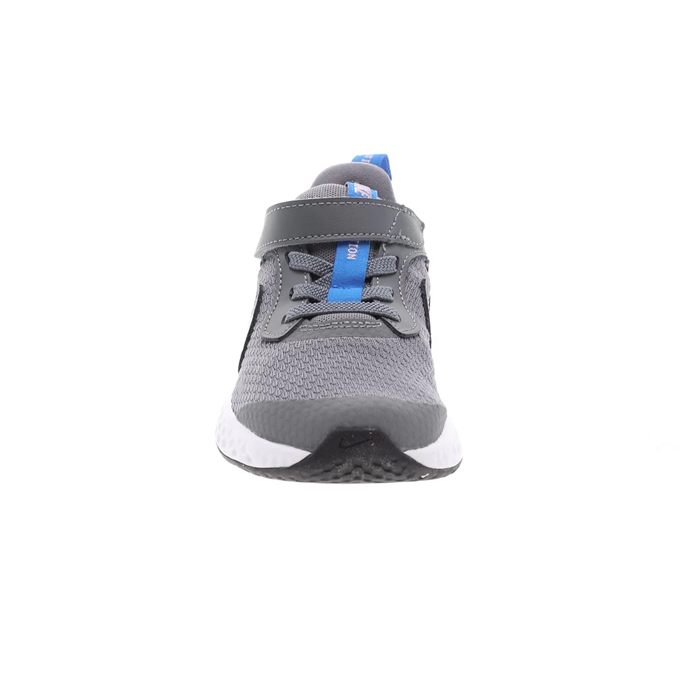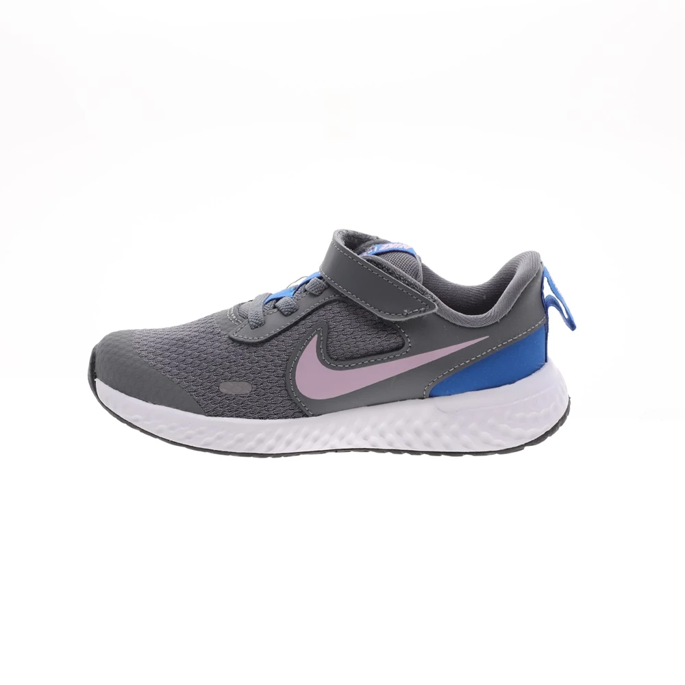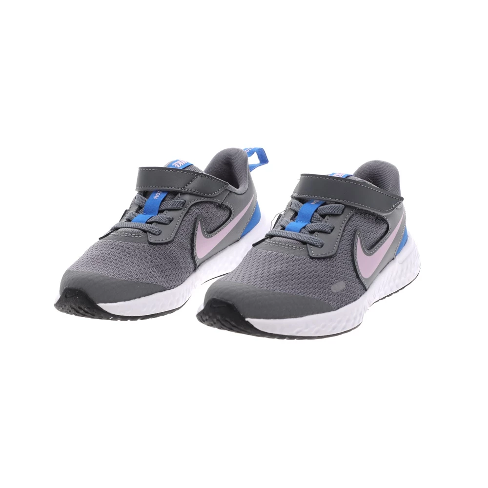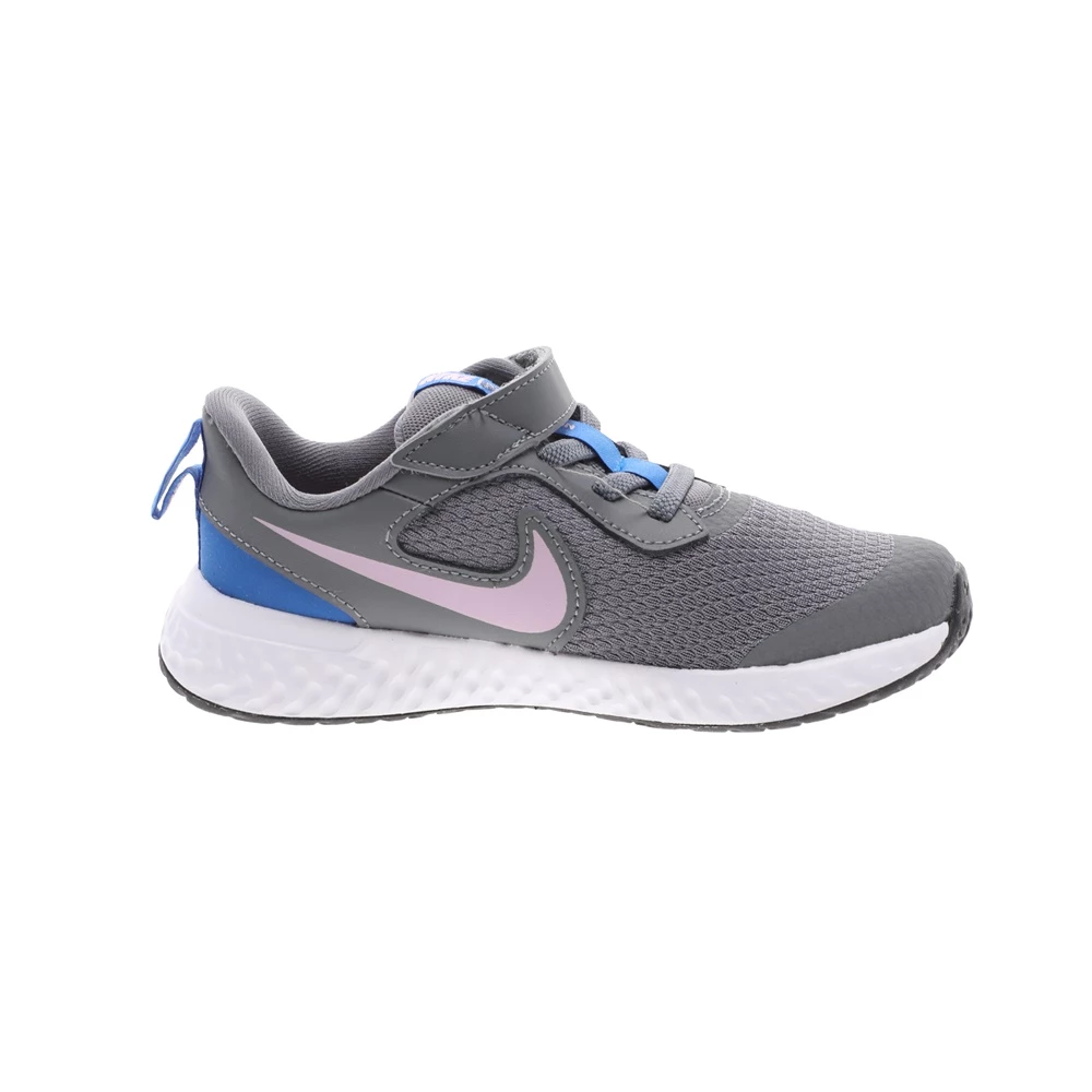 Παιδικά αθλητικά παπούτσια Nike Revolution 5 σε γκρι χρώμα με ροζ Swoosh. Ανάλαφρο επάνω μέρος από πλέγμα, με επικαλύψεις από δέρμα suede χωρίς ραφές, για δροσερή εφαρμογή και σταθερή αίσθηση. Ενδιάμεση σόλα από αφρό για αντικραδασμική προστασία. Εύκαμπτη εξωτερική σόλα από καουτσούκ με βαθιές αυλακώσεις για φυσική κίνηση. Ελαστικά κορδόνια και velcro για εύκολη εφαρμογή και αφαίρεση.