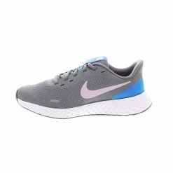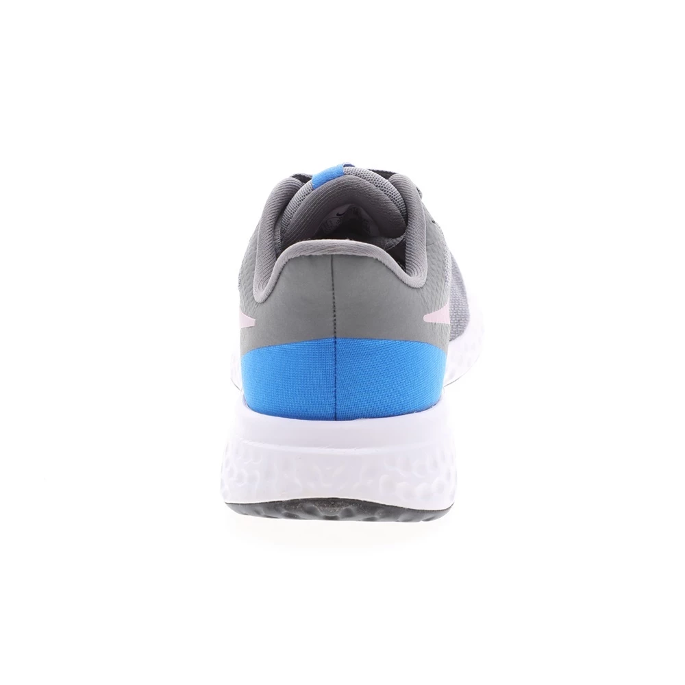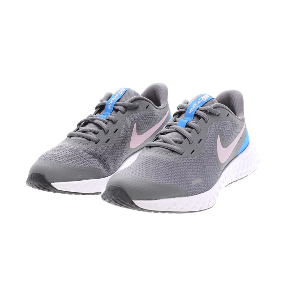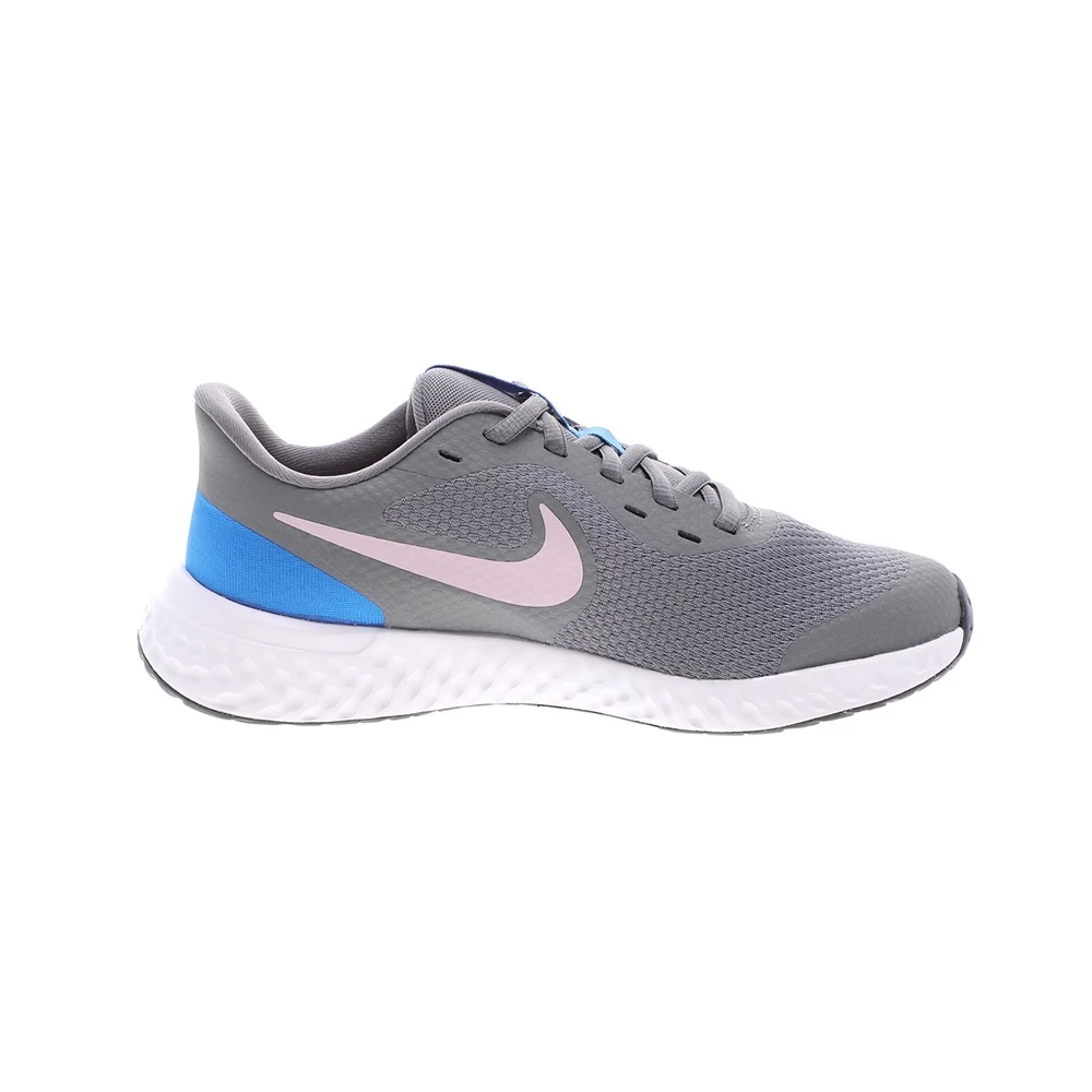 Παιδικά αθλητικά παπούτσια Nike Revolution 5 (GS) σε γκρι απόχρωση με λευκά Swoosh. Ανάλαφρο επάνω μέρος από πλέγμα, με επικαλυπτόμενες φάσες χωρίς ραφές, για δροσερή εφαρμογή και σταθερή αίσθηση. Ενδιάμεση σόλα από αφρό για αντικραδασμική προστασία. Εύκαμπτη εξωτερική σόλα από καουτσούκ με βαθιές αυλακώσεις για φυσική κίνηση. Δένουν με κορδόνια.