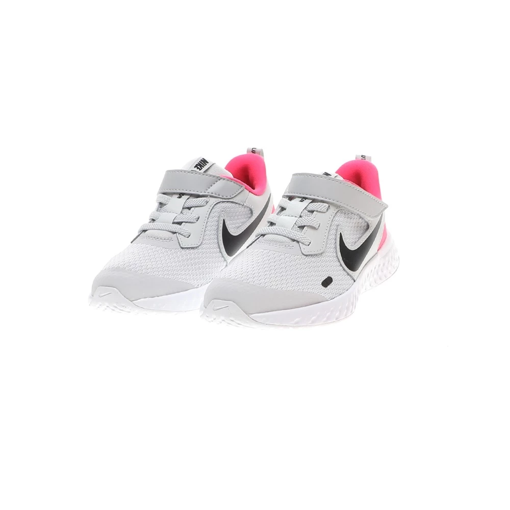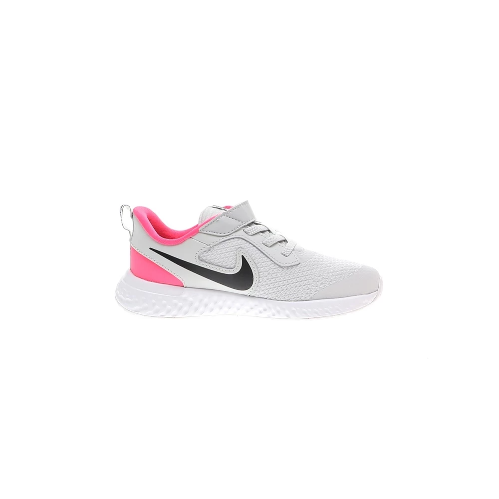 Παιδικά αθλητικά παπούτσια Nike Revolution 5 (PSV) σε γκρι απόχρωση. Ανάλαφρο επάνω μέρος από πλέγμα, με επικαλύψεις από δέρμα σουέντ χωρίς ραφές, για δροσερή εφαρμογή και σταθερή αίσθηση. Ενδιάμεση σόλα από αφρό για αντικραδασμική προστασία. Εύκαμπτη εξωτερική σόλα από καουτσούκ με βαθιές αυλακώσεις για φυσική κίνηση. Ελαστικά κορδόνια και velcro για εύκολη εφαρμογή και αφαίρεση.