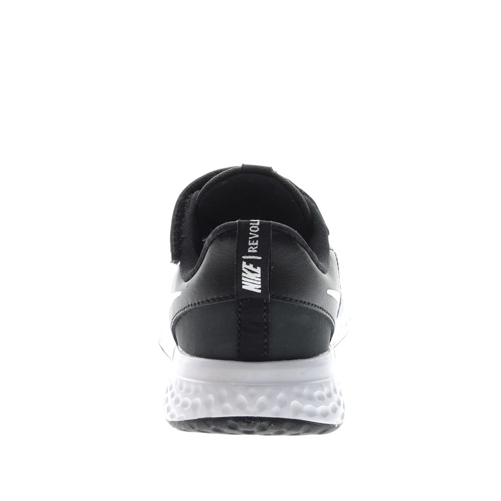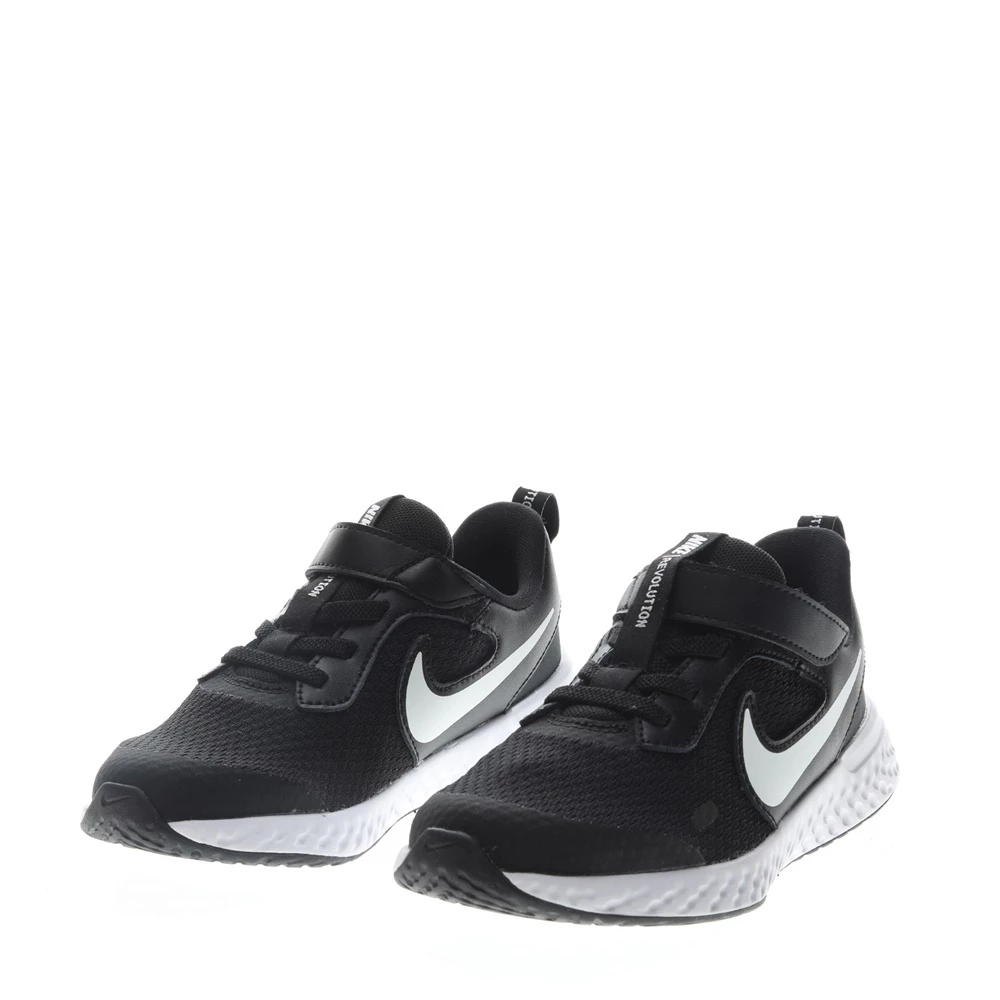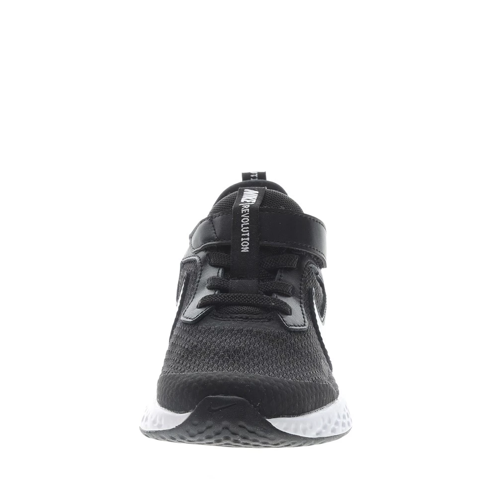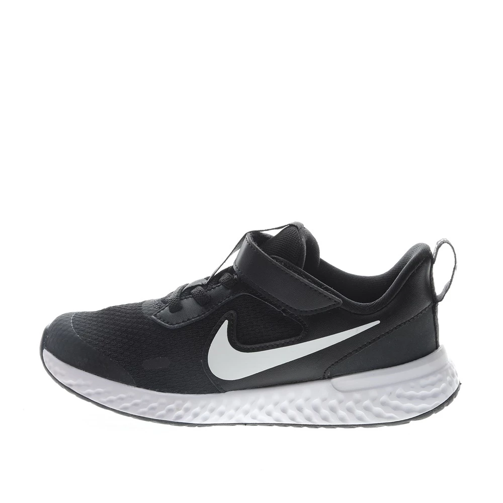 Παιδικά αθλητικά παπούτσια Nike Revolution 5 (PSV) σε μαύρο χρώμα με λευκά Swoosh. Ανάλαφρο επάνω μέρος από πλέγμα, με επικαλύψεις από δέρμα suede χωρίς ραφές, για δροσερή εφαρμογή και σταθερή αίσθηση. Ενδιάμεση σόλα από αφρό για αντικραδασμική προστασία. Εύκαμπτη εξωτερική σόλα από καουτσούκ με βαθιές αυλακώσεις για φυσική κίνηση. Ελαστικά κορδόνια και velcro για εύκολη εφαρμογή και αφαίρεση.